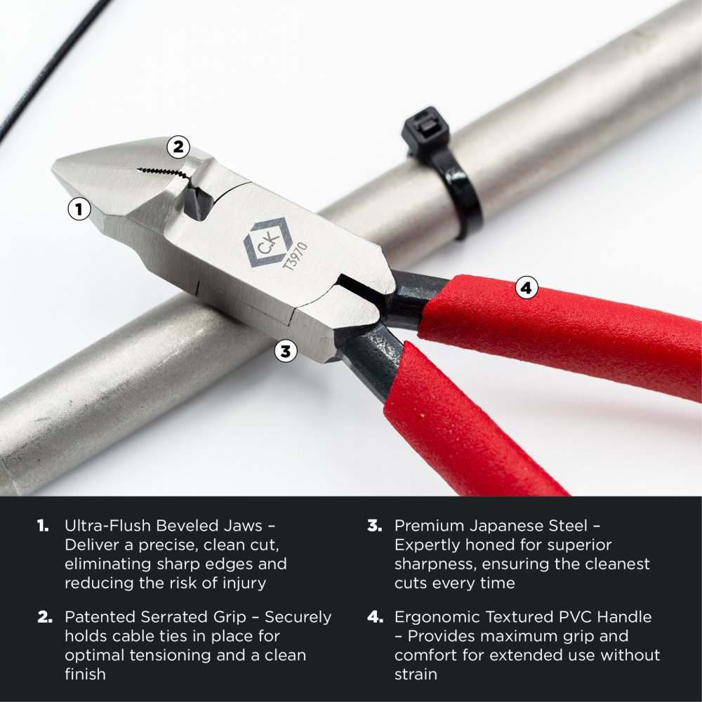- Ultra-Flush Beveled Jaws – Deliver a precise, clean cut, eliminating sharp edges and reducing the risk of injury.